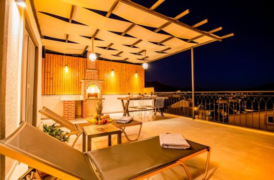 Our summer rental apartment has a large jacuzzi, pergola, seating group, barbecue, dining table and chairs on the terrace, and you can be sure that you will have fun times with your loved ones overlooking the sea view.