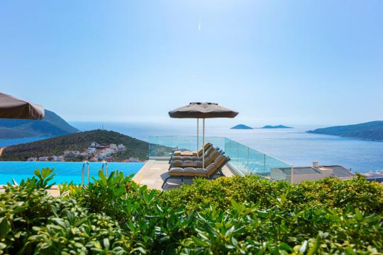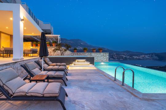 4 Bedroom luxury villa rental in Kalkan with full seaview, stunning infinity pool, luxury design. With full air conditioning, monochrome décor and cool marble floors throughout, its ground floor is an airy open space where the large living room leads out to the dining and pool terrace, and the kitchen is complete with modern appliances and granite work surfaces.
