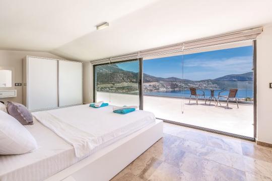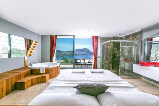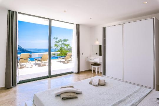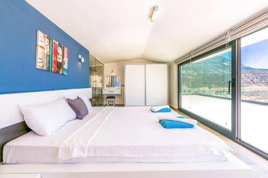 Bedroom - 5 (En-suite Double) : The En-suite Double Bedroom with sea and nature view has Double bed, Nightstand, TV, Dressing table, Wardrobe, Air conditioning and Bathroom with shower. There is a huge roof terrace with fantastic kalkan sea views.