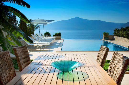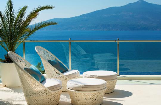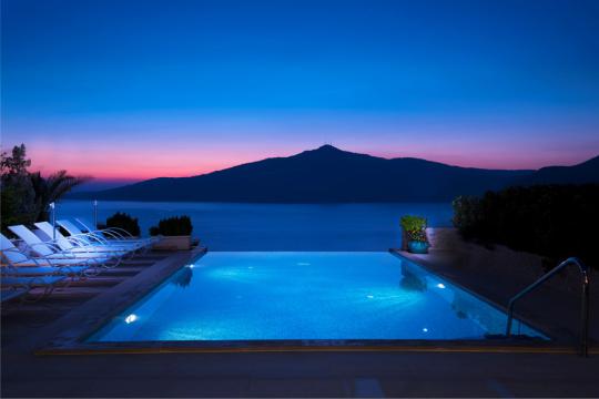 The large, cool interiors have been designed with a palette of neutral colours, with the occasional dramatic painting throwing in a splash of colour. Floor to ceiling windows in the large sitting room maximise the views over the bay, and open onto a loggia which is an ideal spot for al fresco dining or simply relaxing in an armchair away from the heat of the day. It is the perfect place to track the sailing boats, wooden built gulets and occasional splashy gin palaces which glide in and out of the harbour throughout the day.