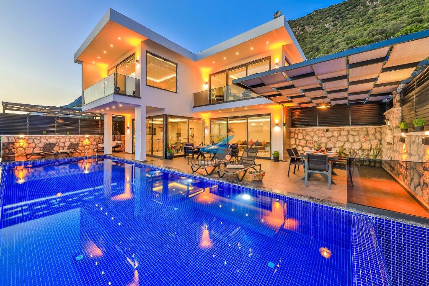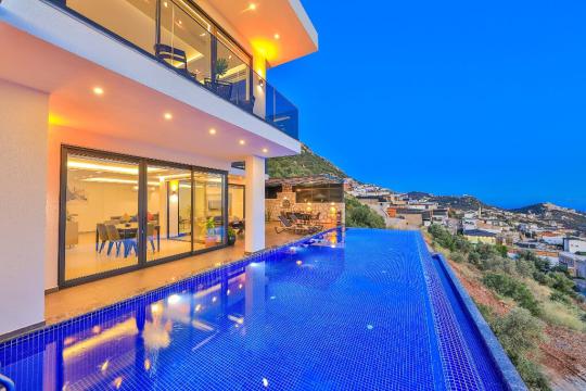 Panoramic Kalkan and Sea View, Large family villa, Luxury interior and exterior decoration, Quiet location, Barbecue on the pool terrace, Private holiday villa with jacuzzi, Rental villas and summer houses located close to Kalkan center and the sea, Kalkan daily rental luxury holiday house.