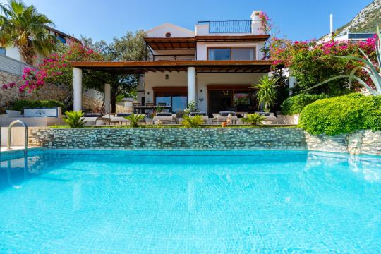 Our luxury holiday home located in Kalkan has 3 bedrooms, a capacity of 6 people, a private swimming pool, a large pool terrace, a barbecue and sun umbrellas and sun loungers on the pool terrace.