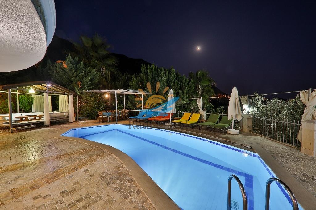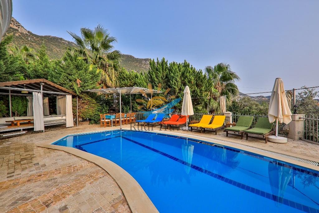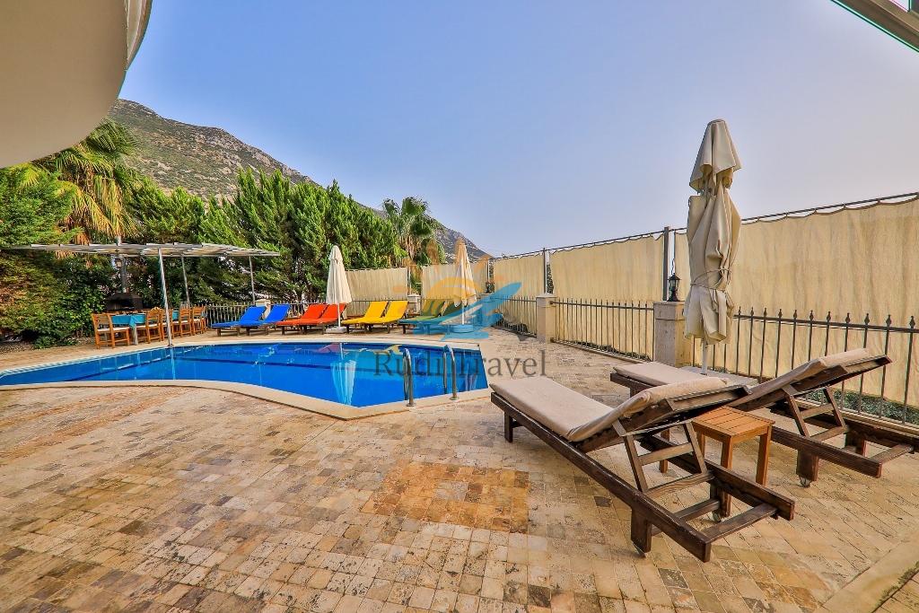 Kalkan Cozy House has a large garden and pool terrace for your comfort, equipped with sun loungers, parasols, a barbecue, an Ottoman-style dining table and chairs, and a seating area.