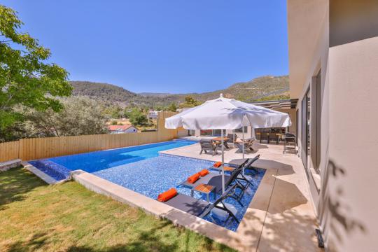 Villa Aqua Luxury Kalkan has a large garden and pool terrace, and there are sun loungers, sun umbrellas, a sitting pavilion, a swing, a green area, a dining table, barbecue and chairs and a seating group in our pool terrace and garden for the comfort of our guests.