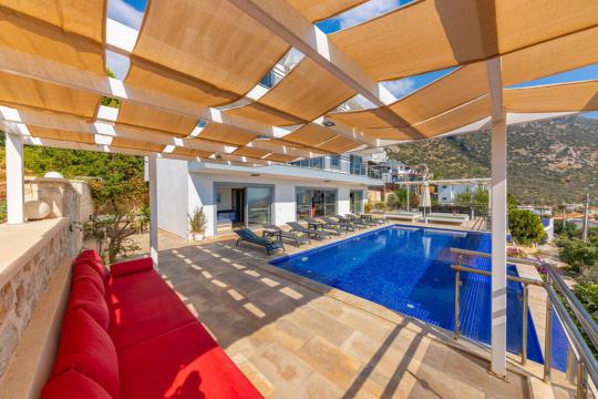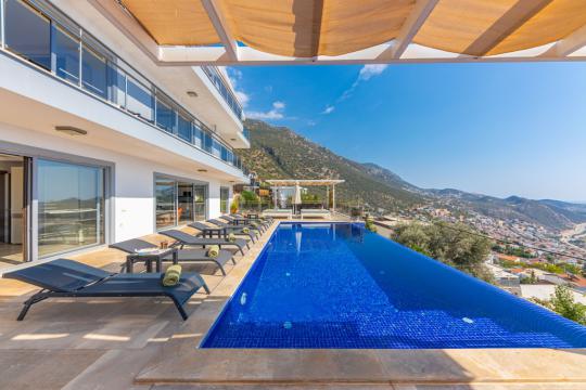 Panoramic Kalkan and sea view, Large family villa, Stylish interior and exterior decoration, Quiet location, Kalkan rental villas and summer houses with private swimming pool and sea view, Antalya daily rental luxury villa, Kalkan rental villa.