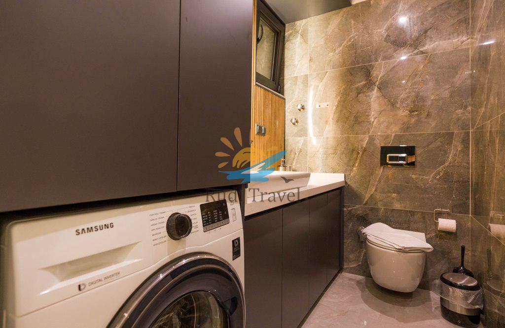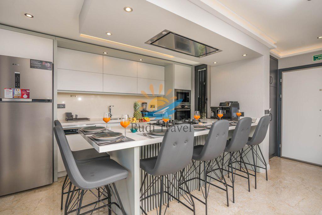 Villa Moonset Kalkan has a luxurious and modern kitchen. It includes a refrigerator, dishwasher, oven, microwave, four-burner hob, kettle, toaster, dinnerware for six people, frying pans, pots, cutlery, etc. If you need anything during your stay, please let us know and we will provide it for you immediately.