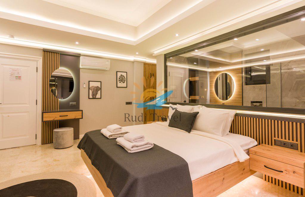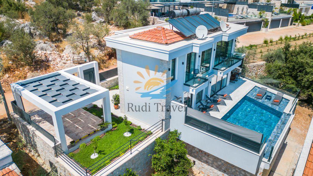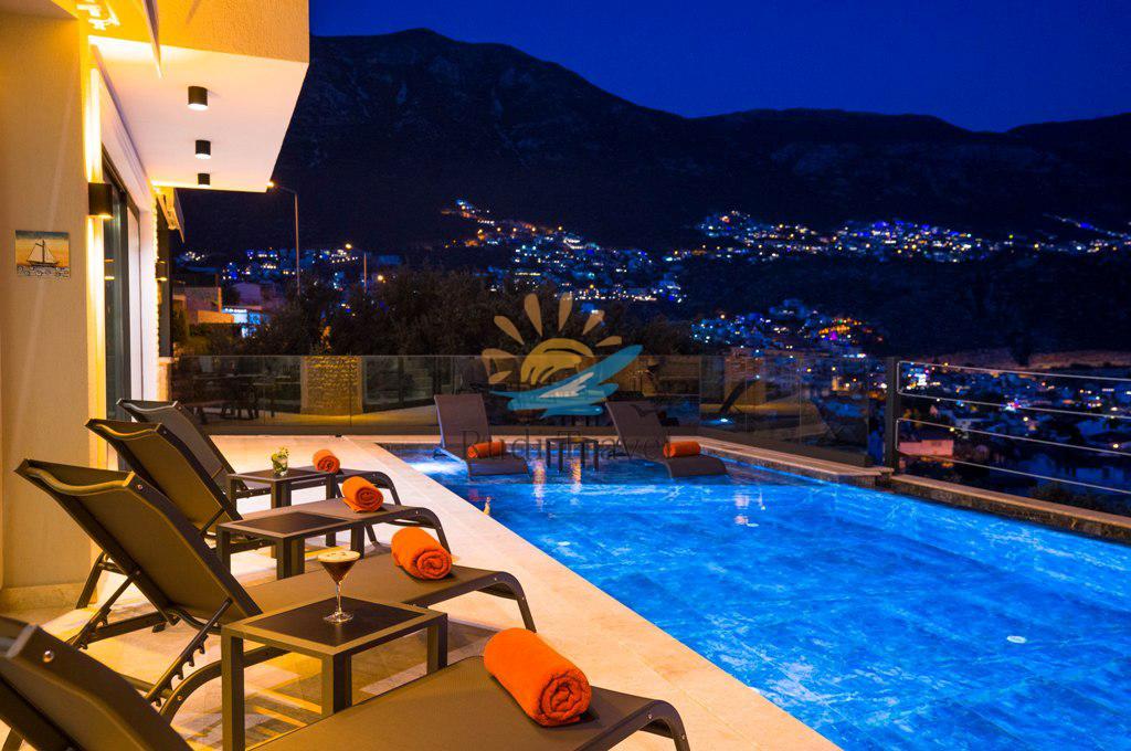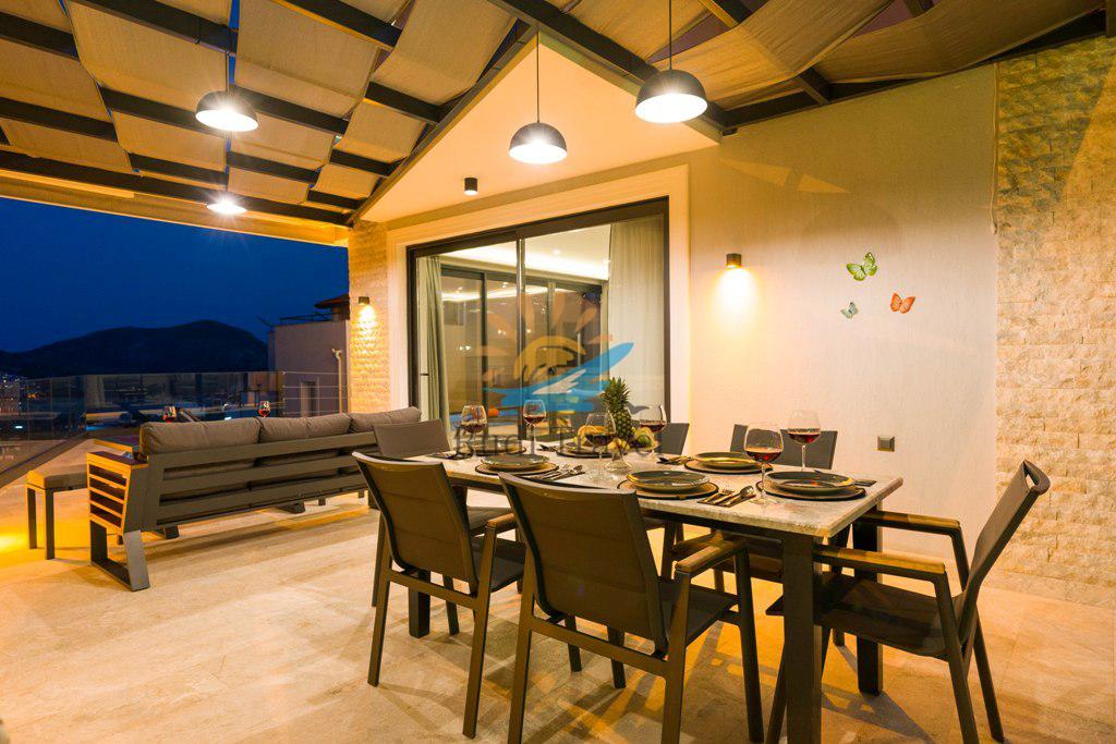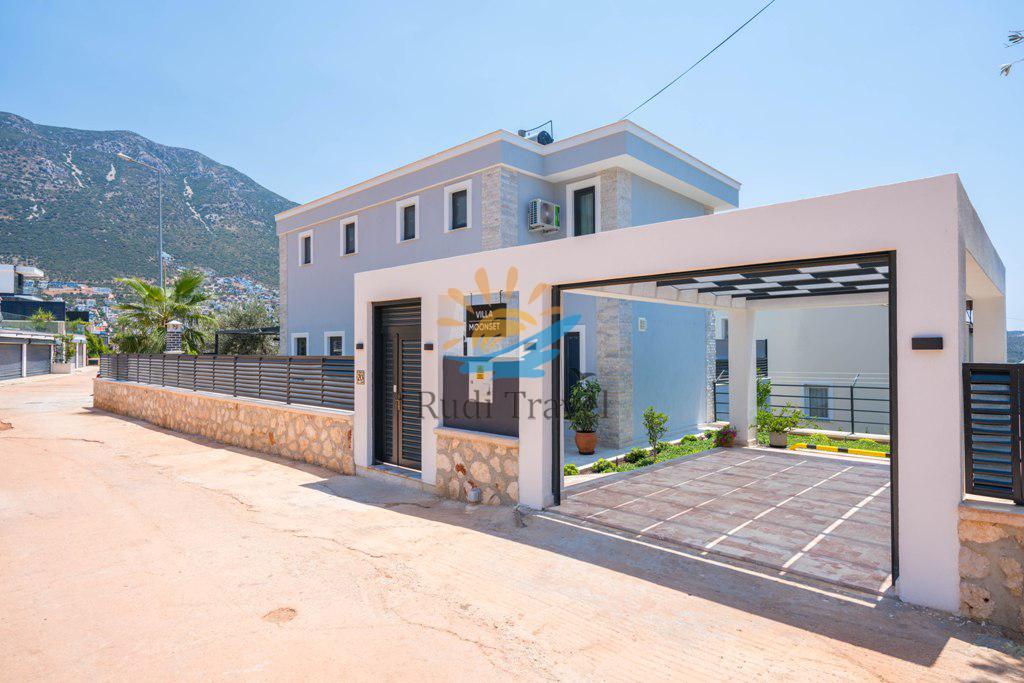 Villa Moonset Kalkan is a luxurious 3-bedroom villa accommodating 6 people, located in the center of Kalkan. It has a private swimming pool, activity room, sauna, heated indoor pool, and is within walking distance of the center, market, and restaurants. This villa offers stunning views of Kalkan and features a luxurious, modern interior and exterior design, with carefully decorated furnishings. The villa is open year-round thanks to its heated indoor pool, making it ideal for honeymoons and family vacations even during the winter months.