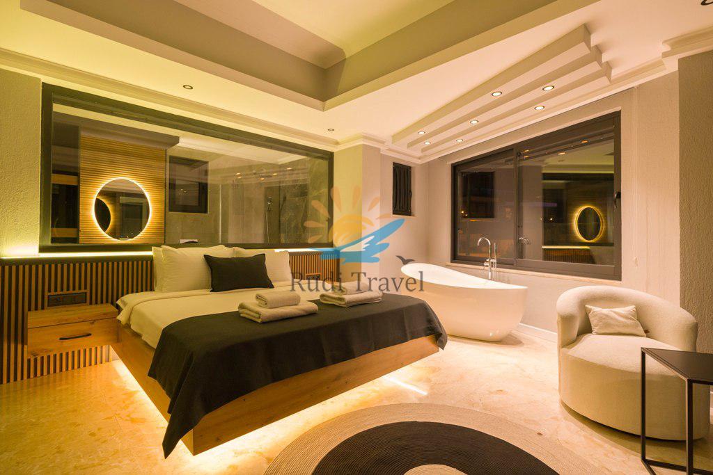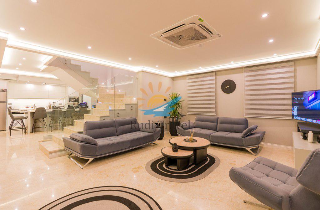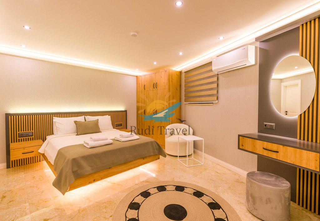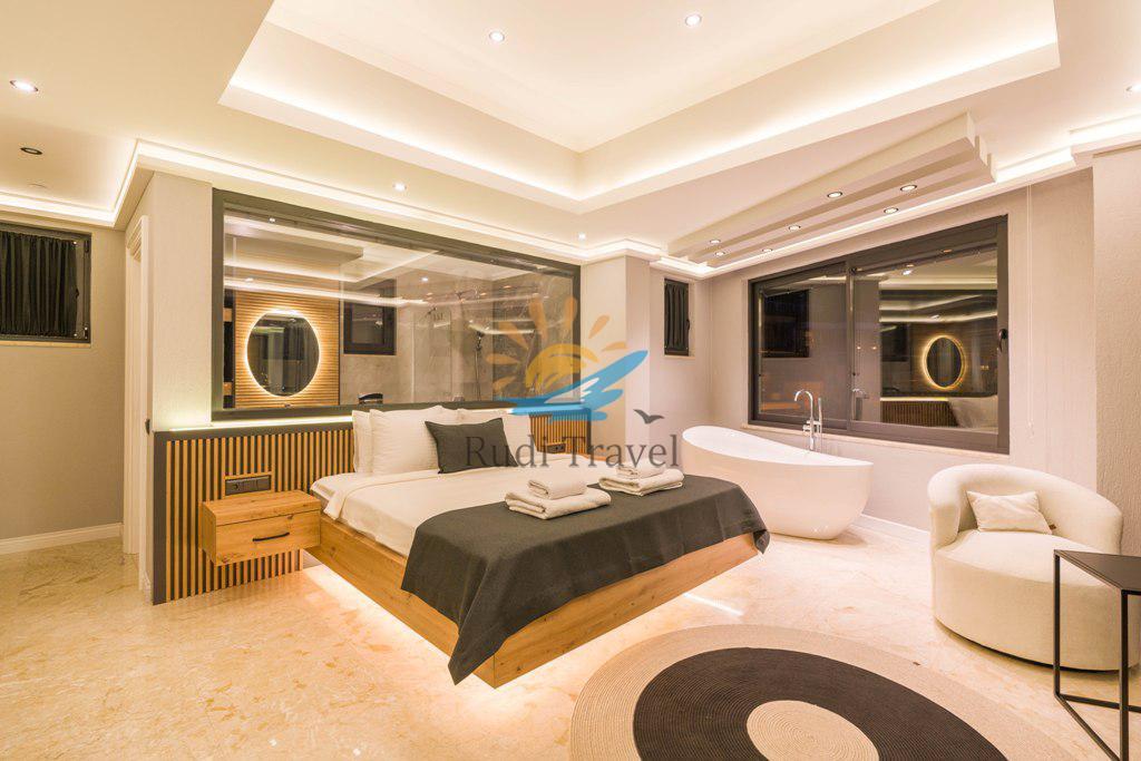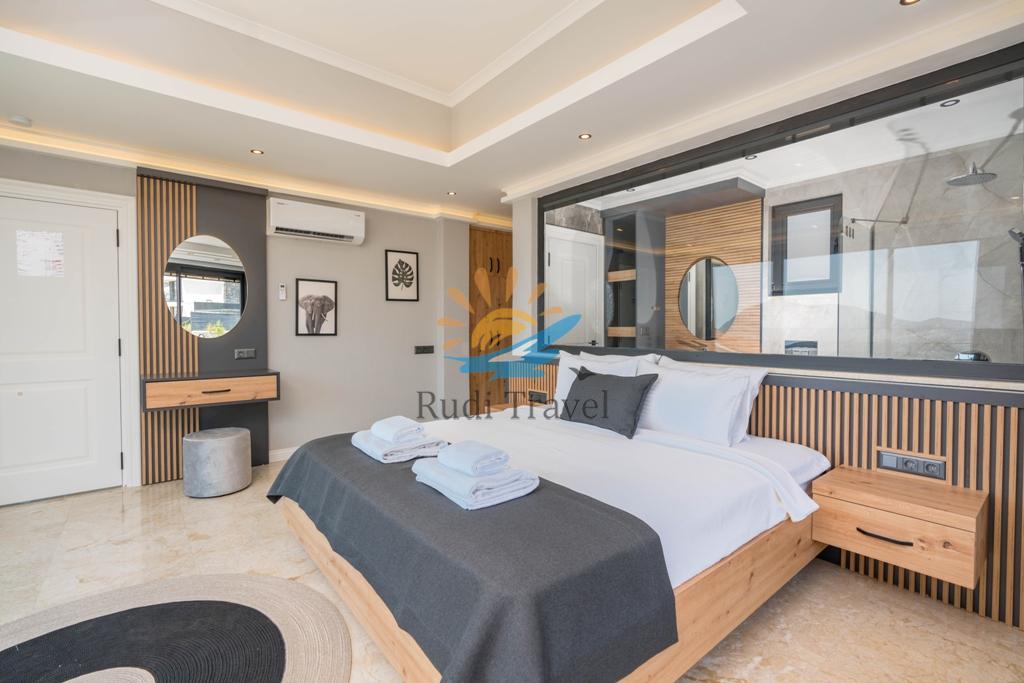 Villa Moonset Kalkan is a luxurious 3-bedroom villa accommodating 6 people, located in the center of Kalkan. It has a private swimming pool, activity room, sauna, heated indoor pool, and is within walking distance of the center, market, and restaurants. This villa offers stunning views of Kalkan and features a luxurious, modern interior and exterior design, with carefully decorated furnishings. The villa is open year-round thanks to its heated indoor pool, making it ideal for honeymoons and family vacations even during the winter months.