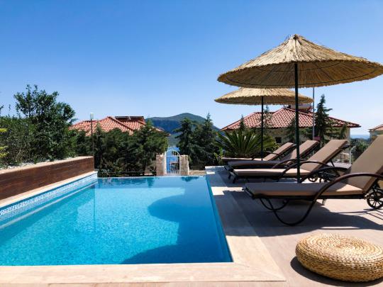 Panoramic Kalkan and Sea View, Large family villa, Kalkan rental villas with modern decoration, A quiet location, Kalkan daily rental villa, Rental villas and summer houses within walking distance to Kalkan center and the sea, Luxury and high quality furnished rental villa, Kalkan rental villa.
