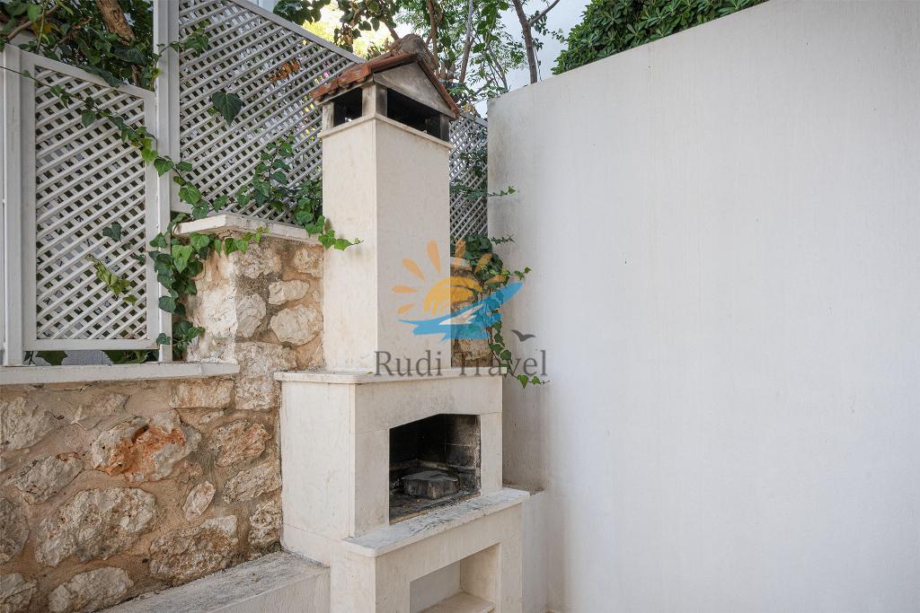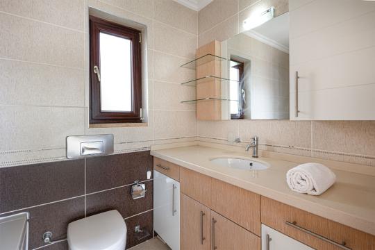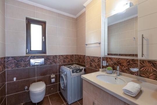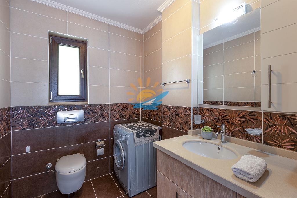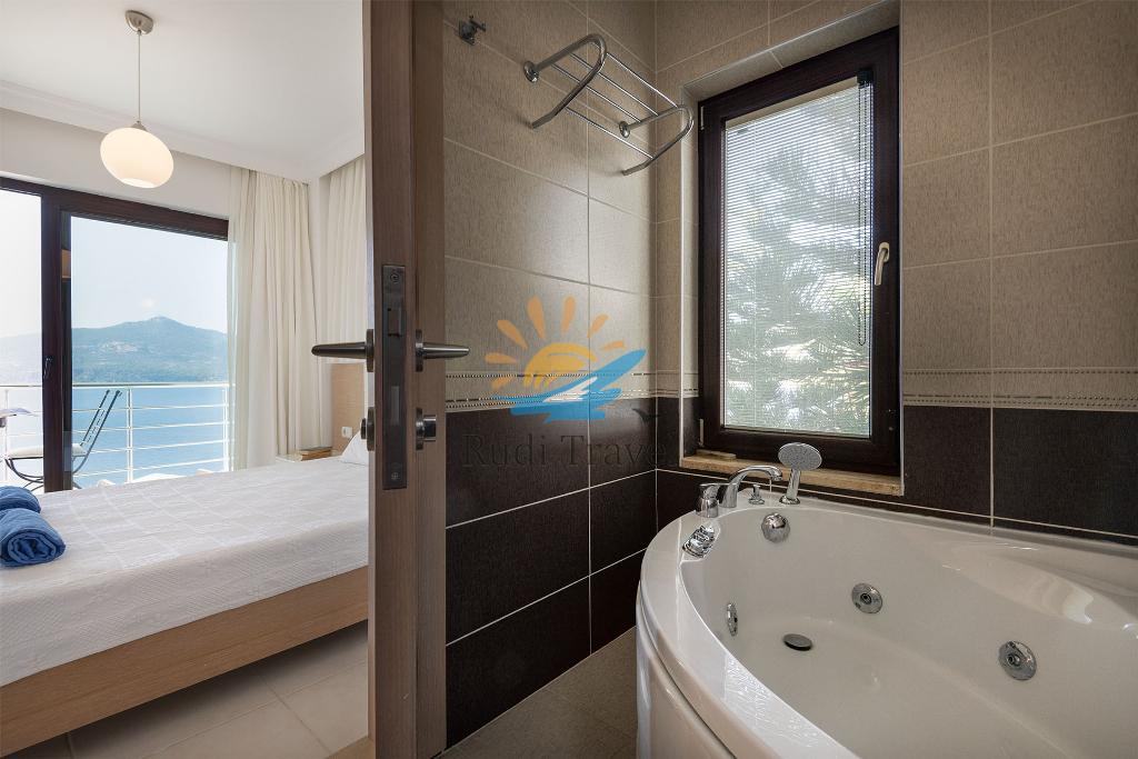 On the first floor, you'll find two additional bedrooms, each with a comfortable double bed and an ensuite bathroom. One bedroom features a shower, while the other boasts a luxurious jacuzzi corner bath. Both bedrooms have access to a small balcony, complete with a table and two chairs, where you can relax and enjoy the stunning sea views while sipping your morning tea or coffee.