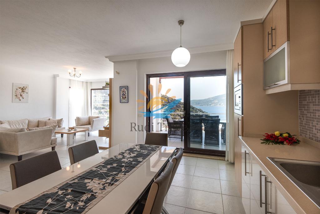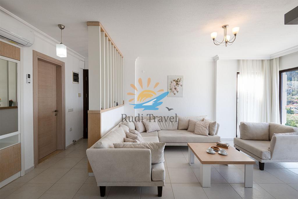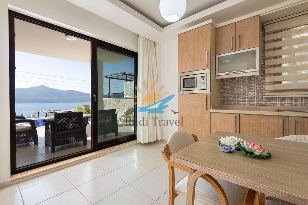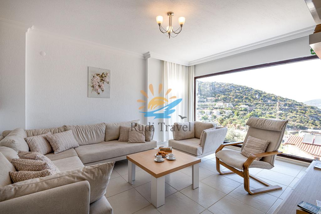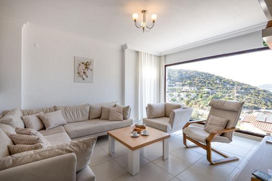 The setup of Sunset Villa is quite unique compared to other homes featured in the Private Collection Kalkan. This 3-bedroom villa offers a distinct layout, with the lower floor (pool level) serving as an independent apartment separate from the upstairs living areas. On this level, you'll find a fully equipped kitchen, a comfortable double bedroom, a shower room, and a spacious living room. Patio doors open out to a shaded seating area that leads directly onto the pool terrace, providing a seamless connection to outdoor relaxation.