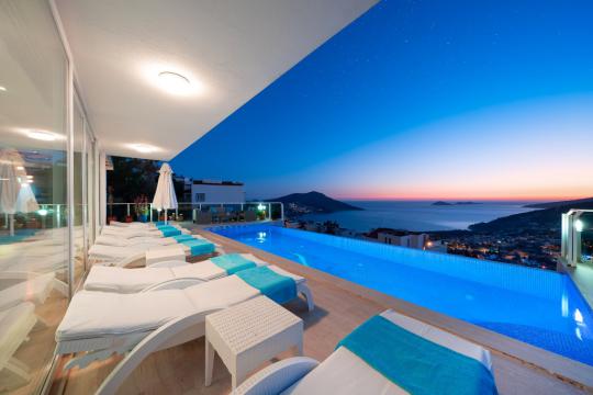 Among our Kalkan colorful rental villas, there is a barbecue, dining table, sun loungers and sun umbrellas on the pool terrace, and you can be sure that you will have a summer holiday with a magnificent sea view.